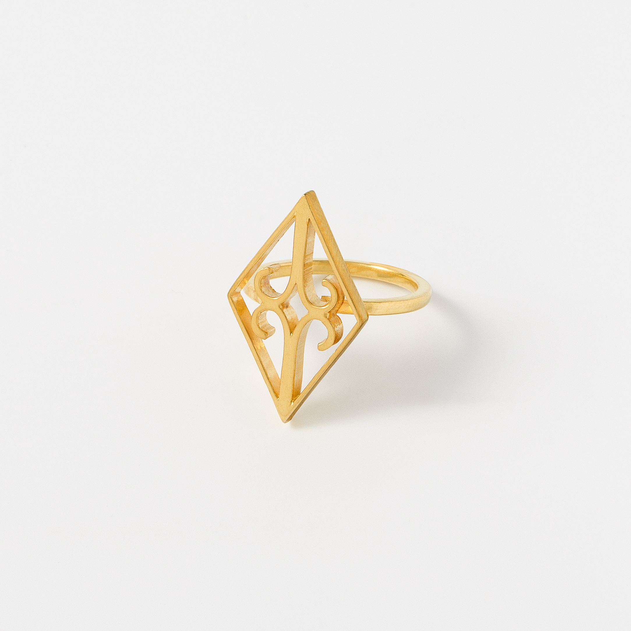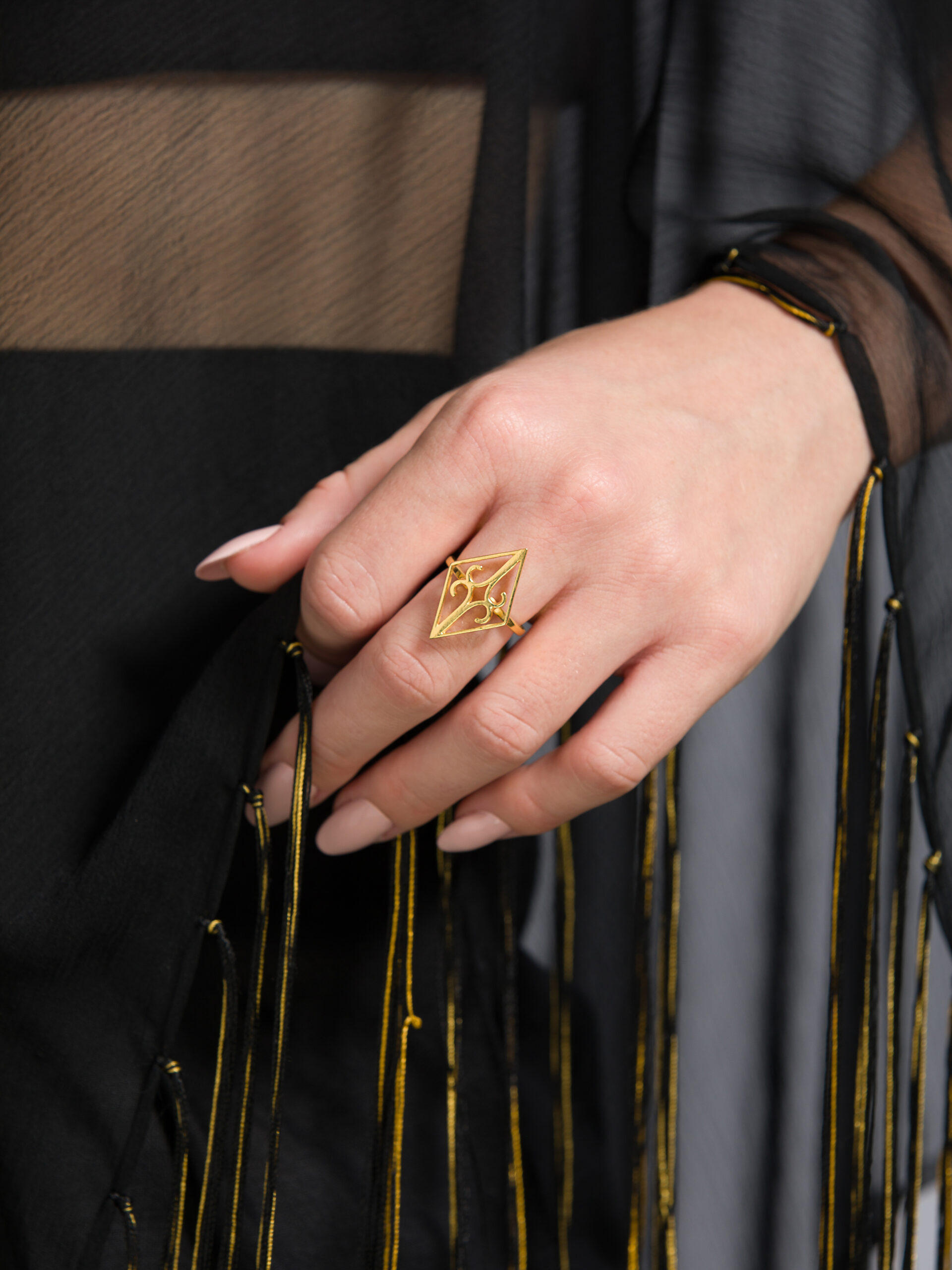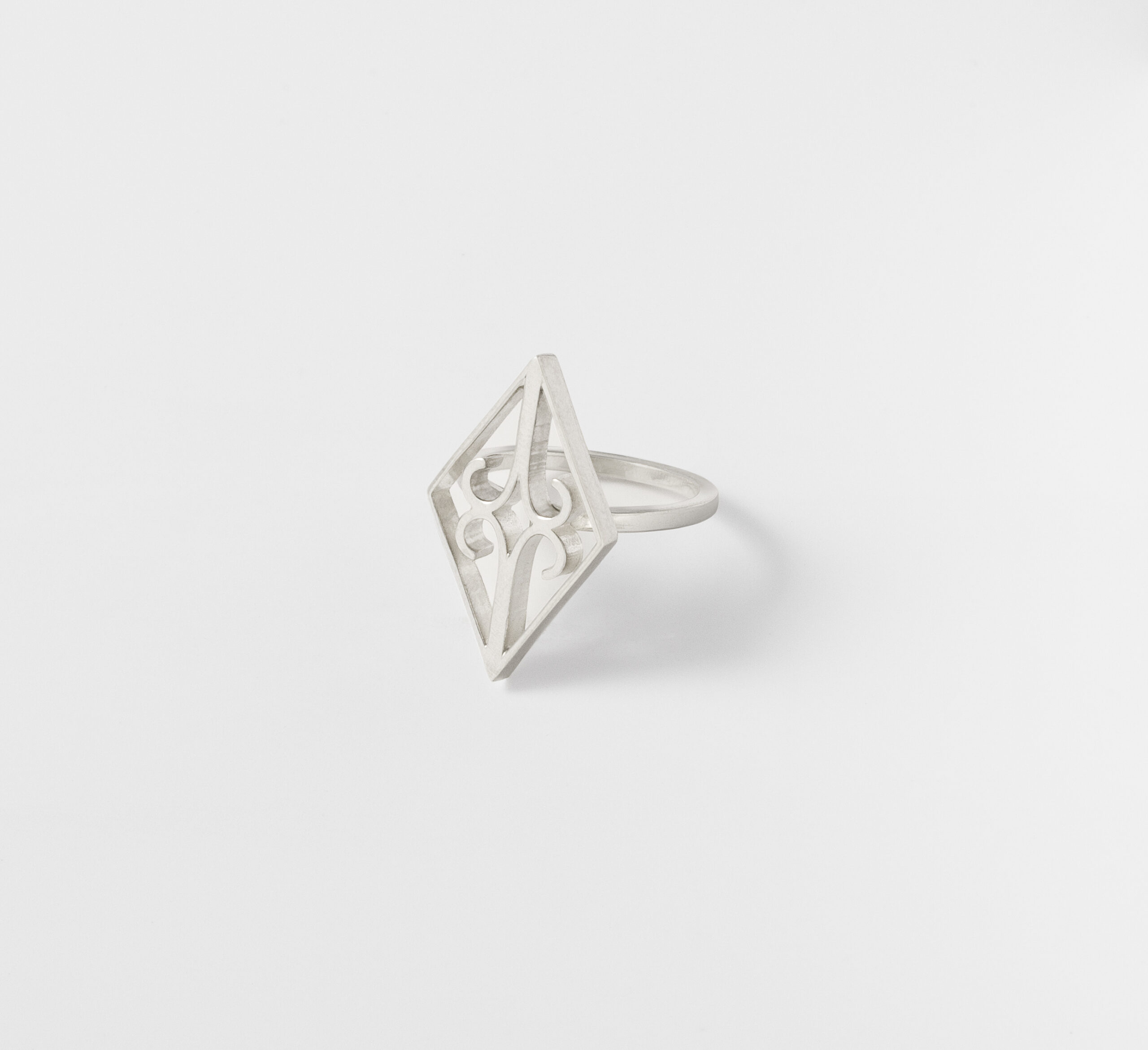 Anillo en forma de rombo y con aro de hilo cuadrado.