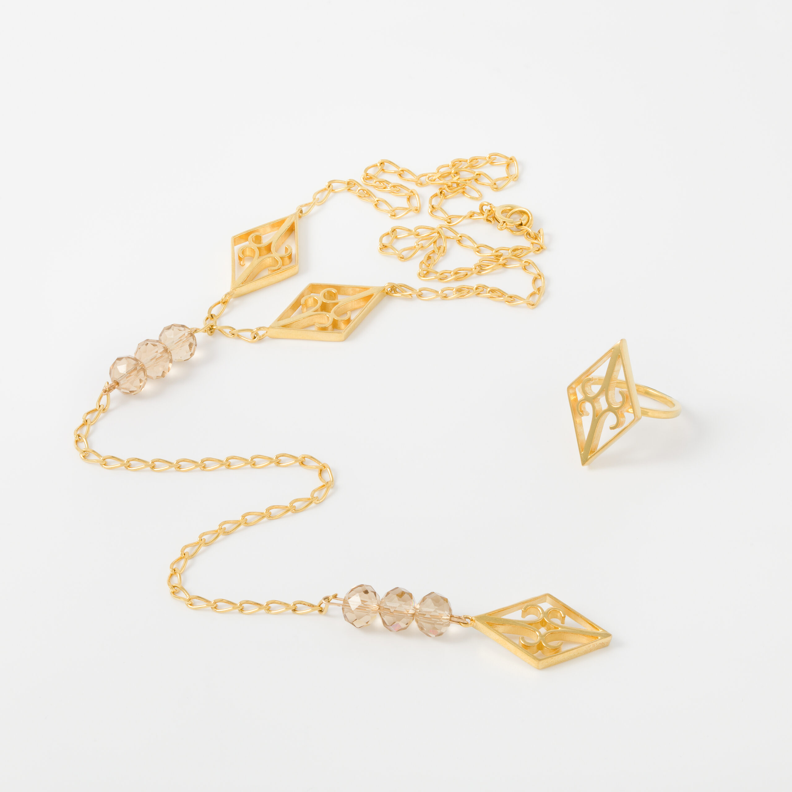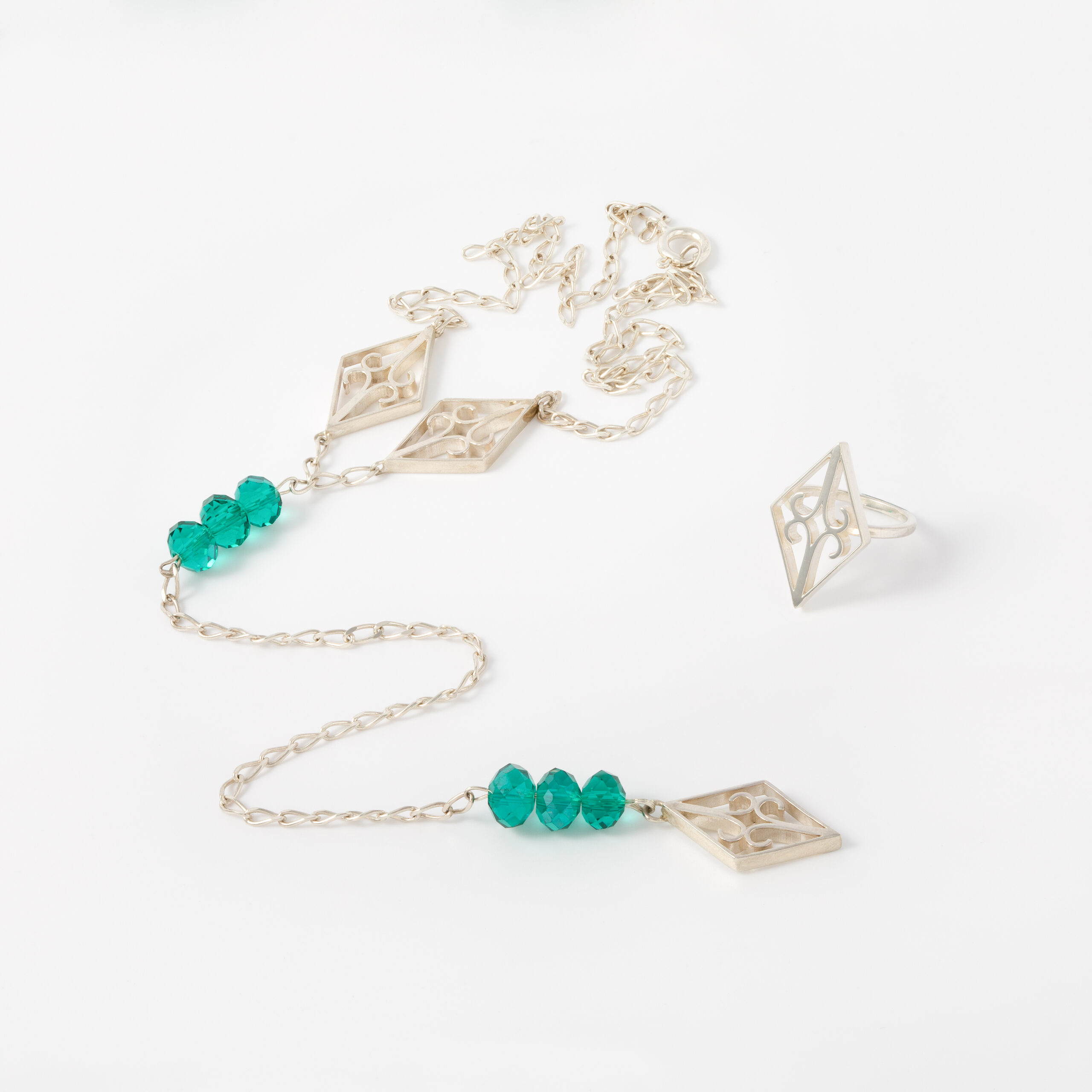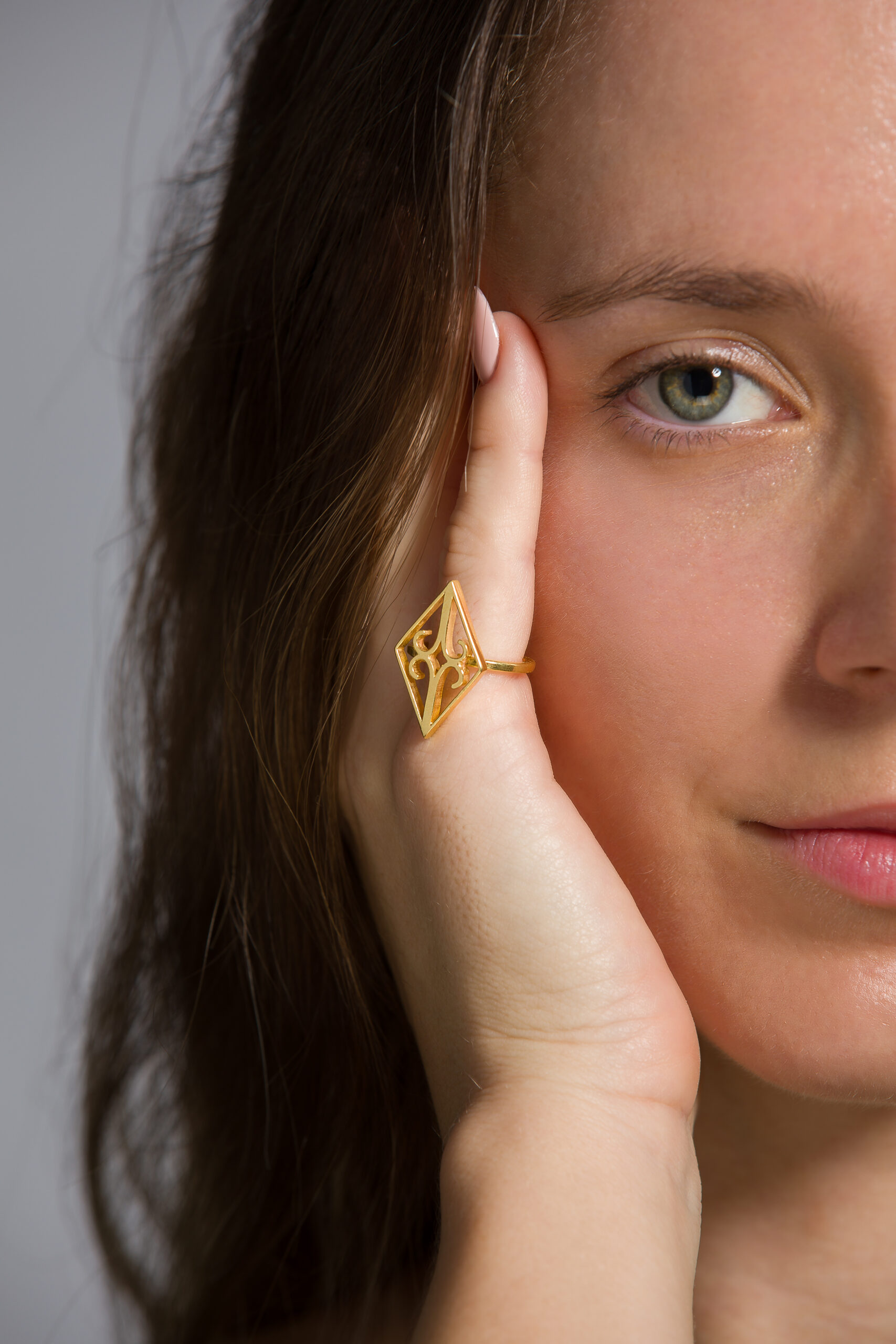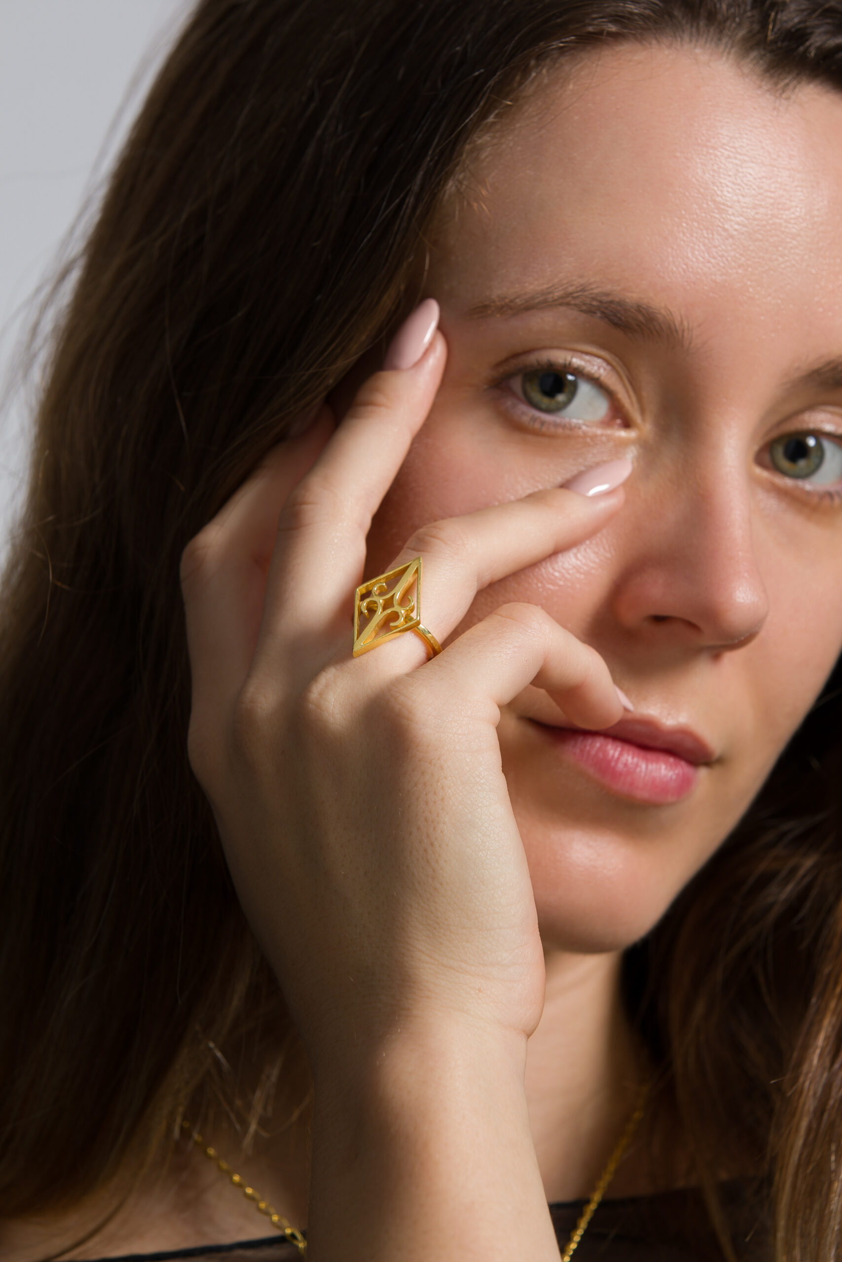 Anillo en forma de rombo y con aro de hilo cuadrado.