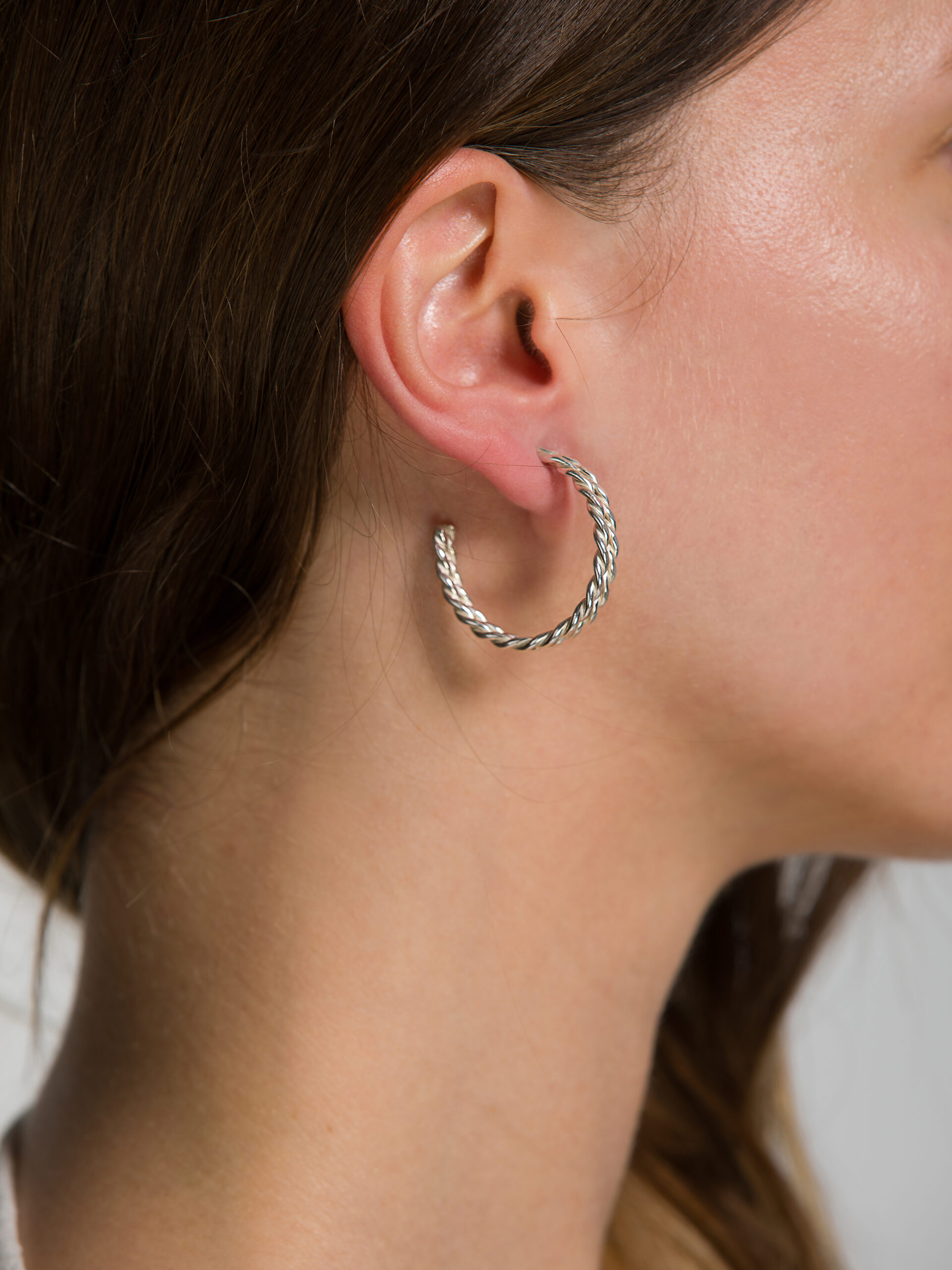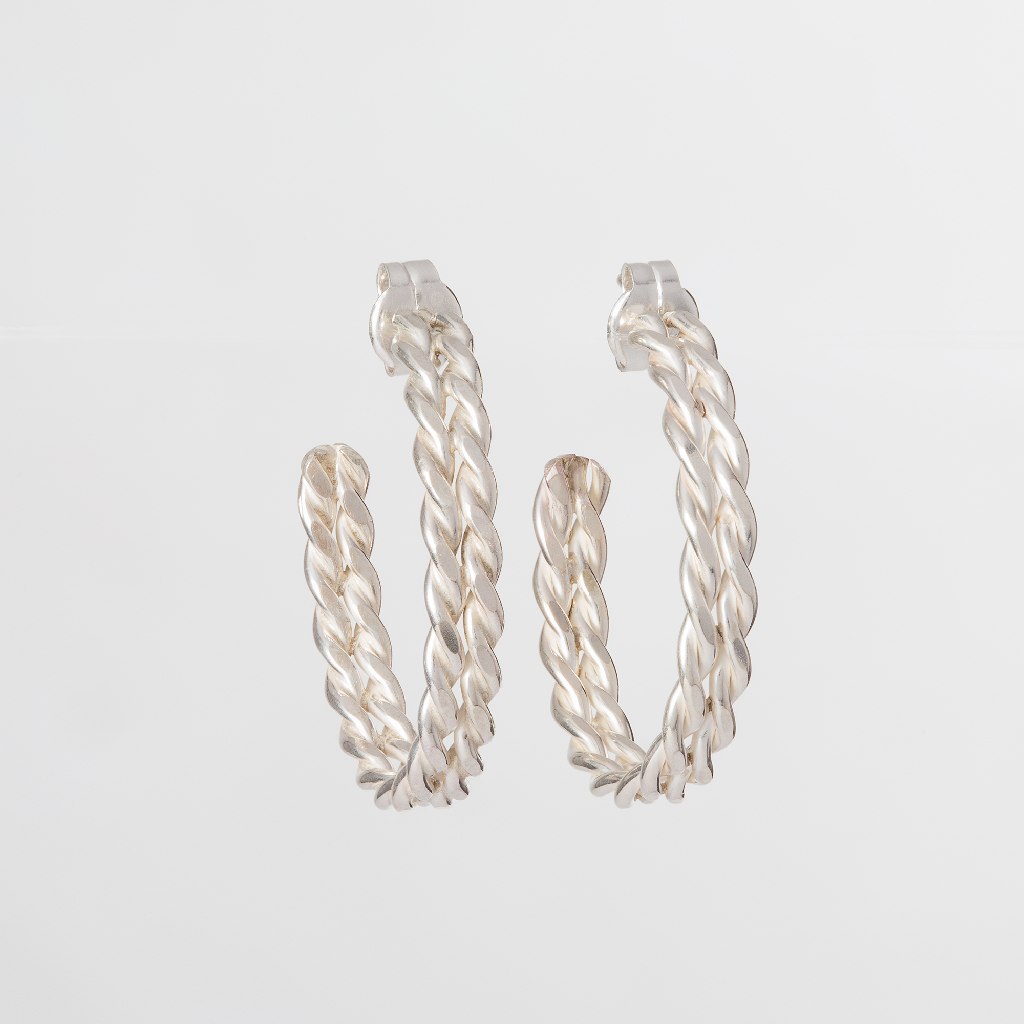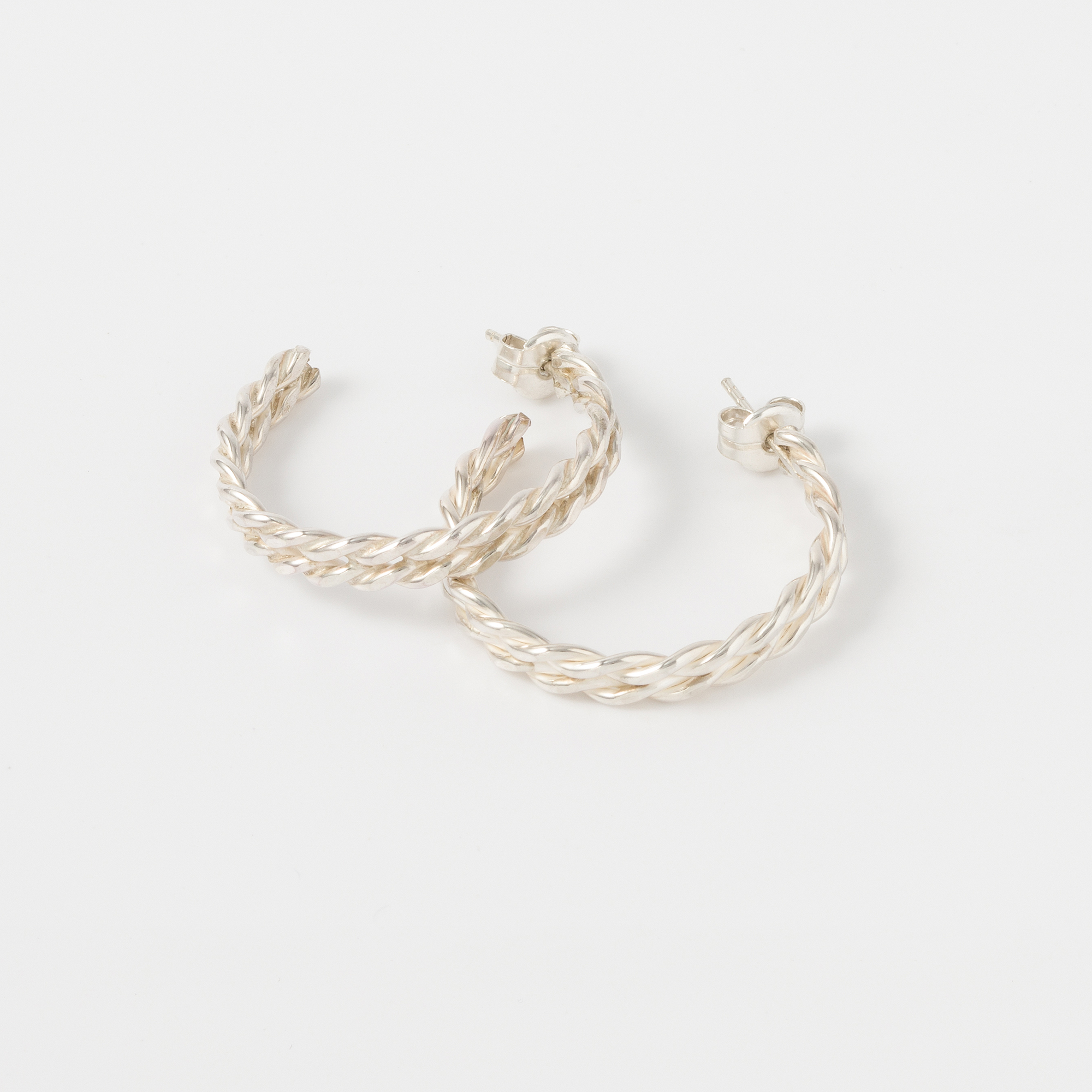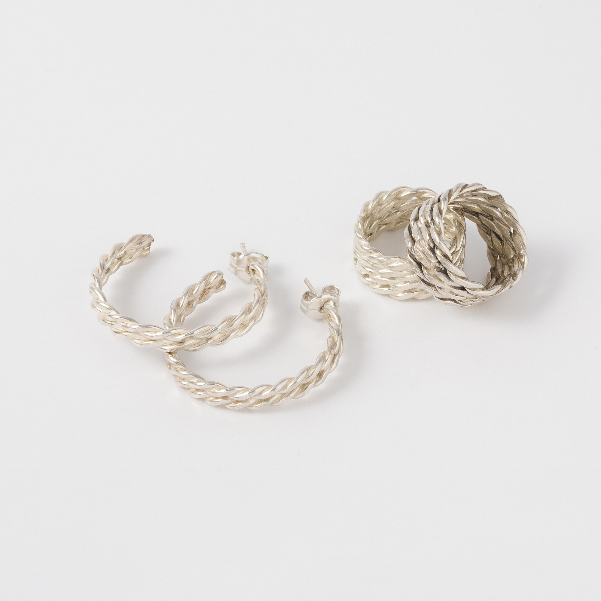 En Ibiza es fácil encontrar artesanía elaborada con tejidos vegetales; desde capazos, cestos y “espardenyas” hasta el propio suelo de los carruajes tirados por caballos de la época. Este trenzado sencillo se repite constantemente en multitud de elementos. Nosotras hemos querido trenzar estos pendientes hechos con hilo de plata.