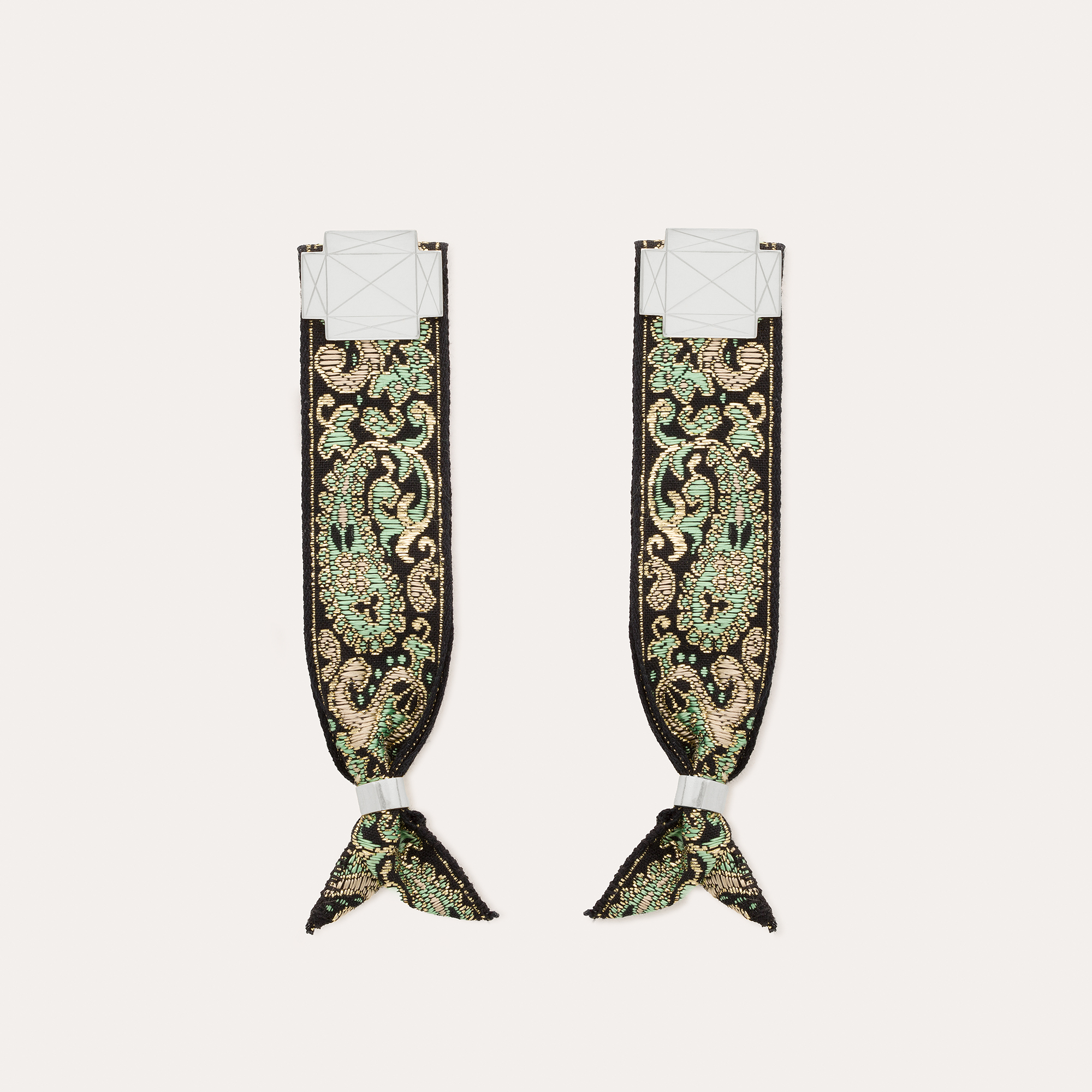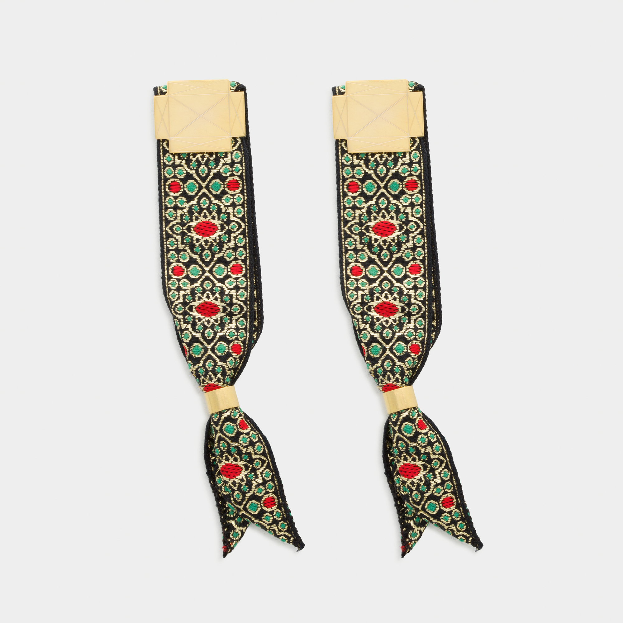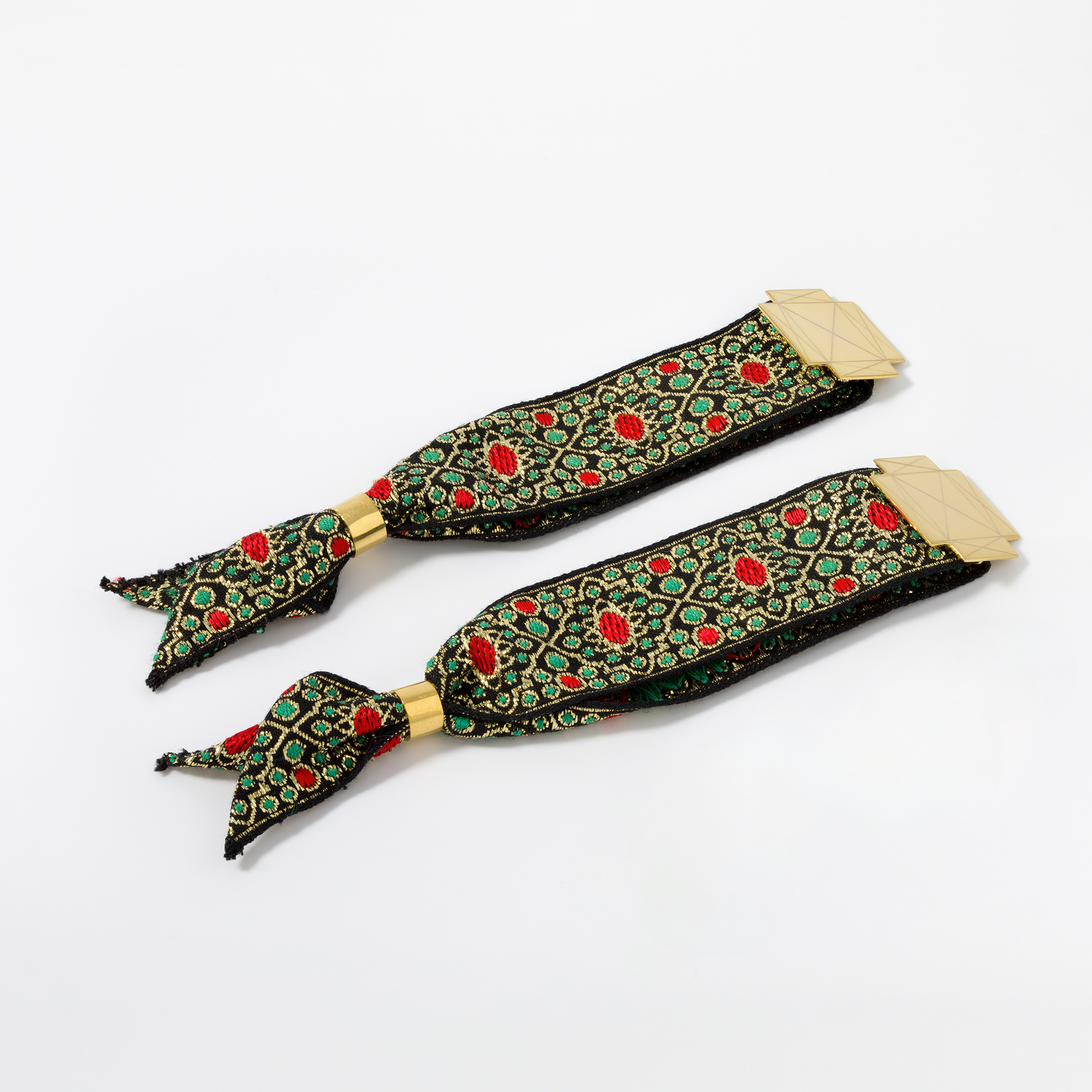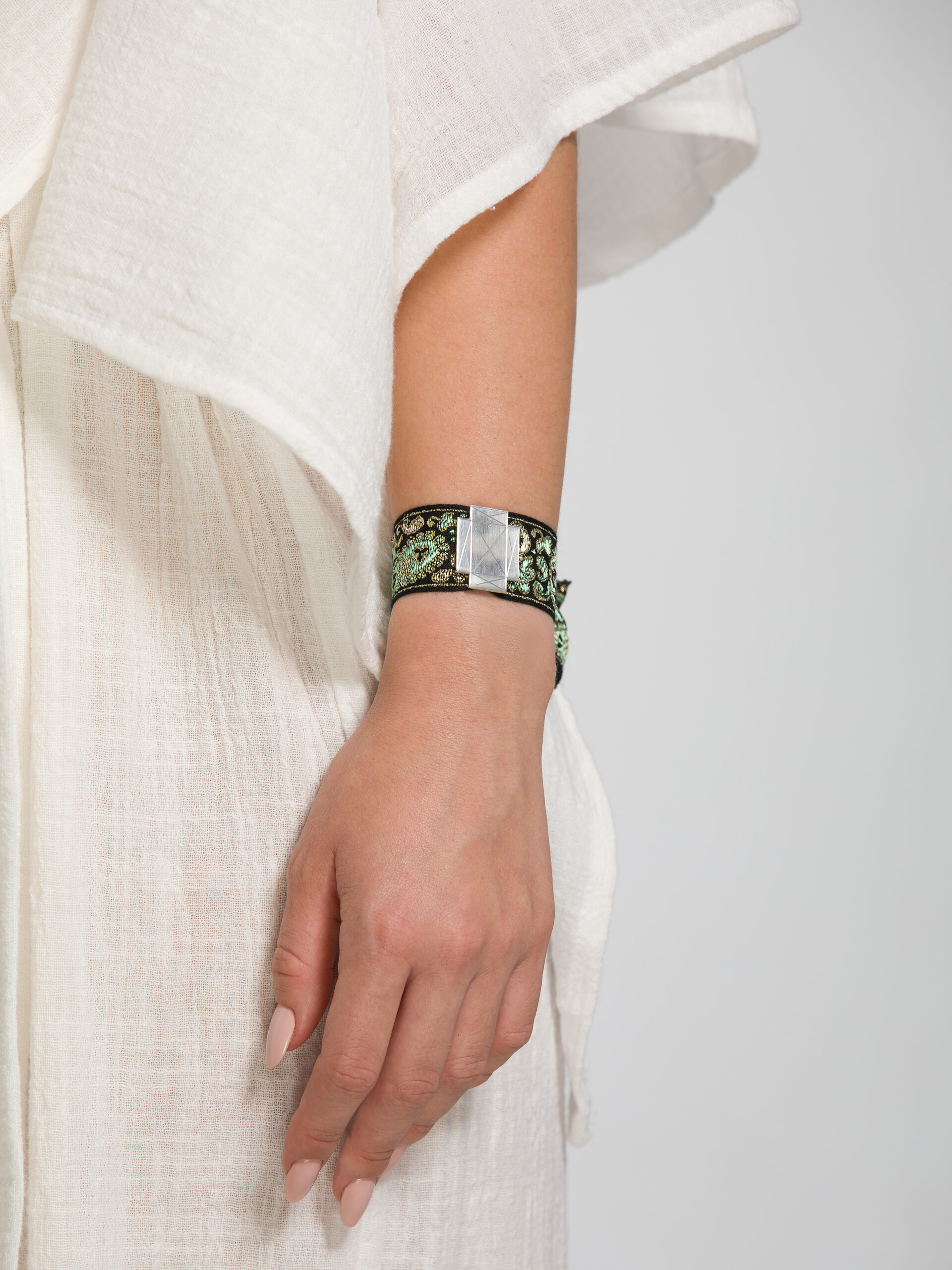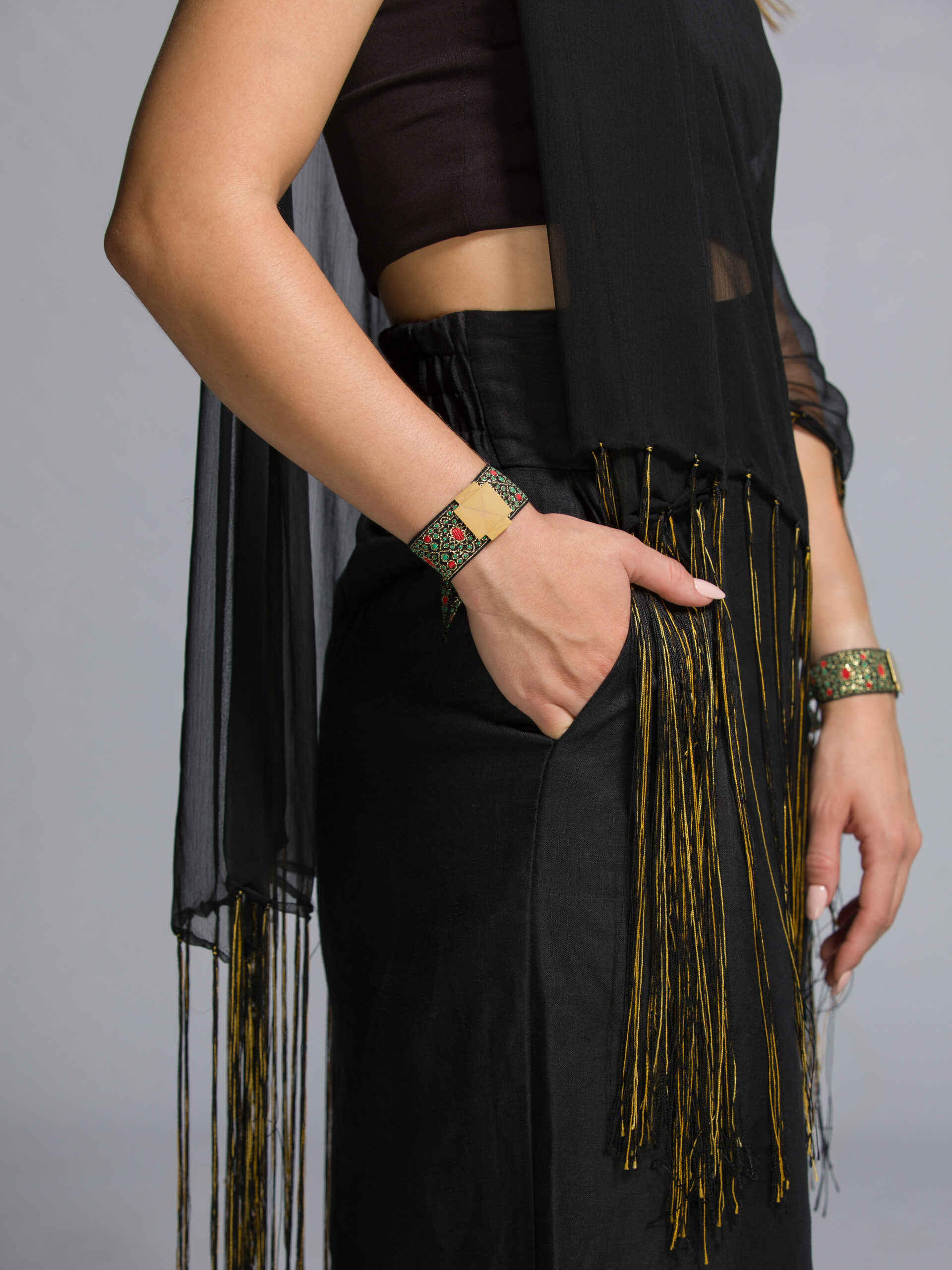 La cinta utilizada para hacer esta pulsera es la misma que se puede encontrar en el traje típico ibicenco femenino. Pueden verse en la espalda o adornando algunos sombreros.